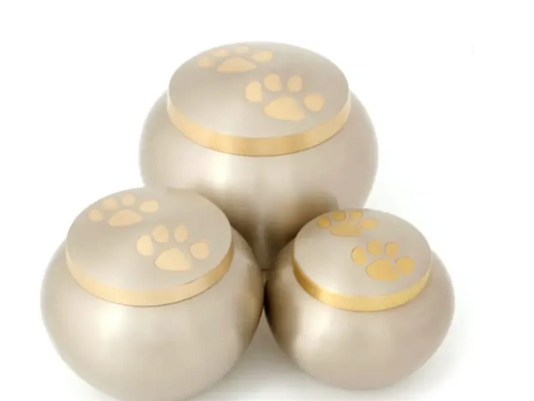 A second choice of brass urn, in a pewter grey with bronze paw prints on the lid. Suitable for longer lasting storing of your pets ashes.